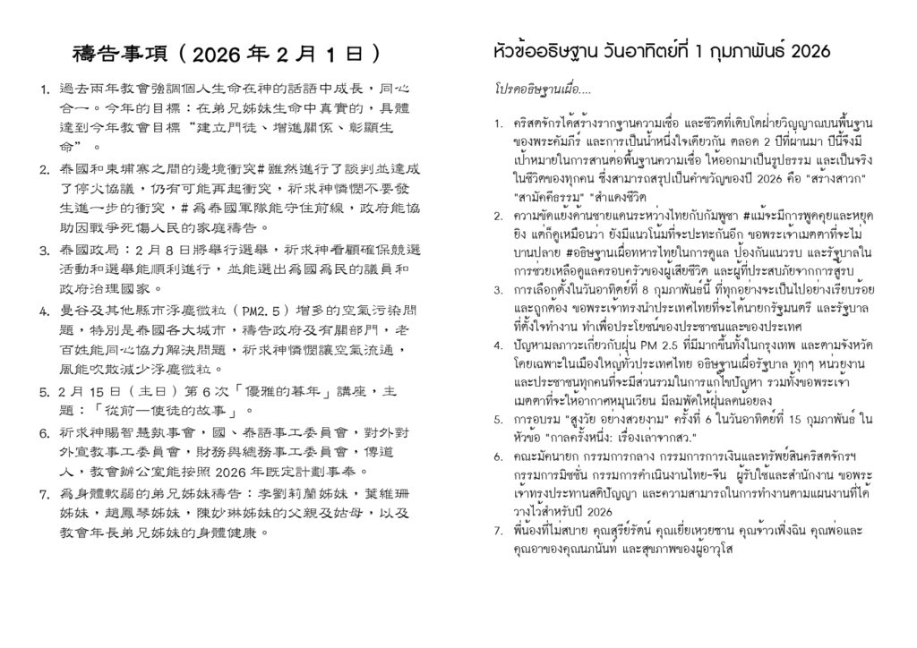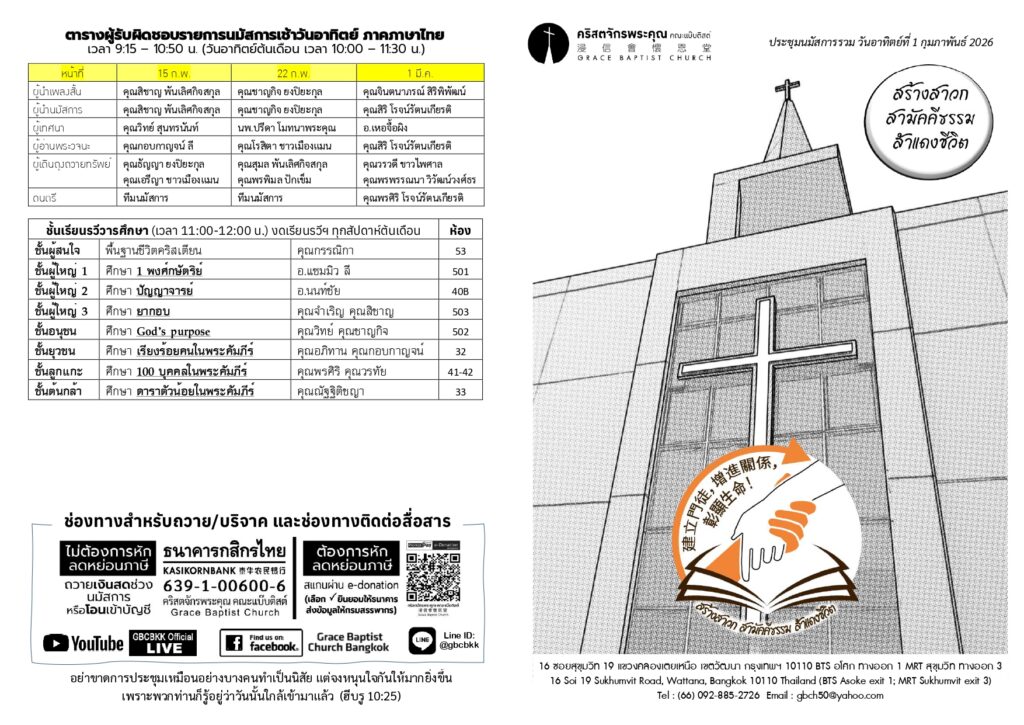 สูจิบัตร : ประชุมนมัสการ วันอาทิตย์ที่ 1 กุมภาพันธ์ ค.ศ. 2026